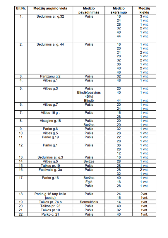В ходе обследования общественных территорий Висагинаса было выявлено значительное количество засохших деревьев. Такие деревья представляют потенциальную угрозу для жителей, а также для зданий и объектов инфраструктуры.