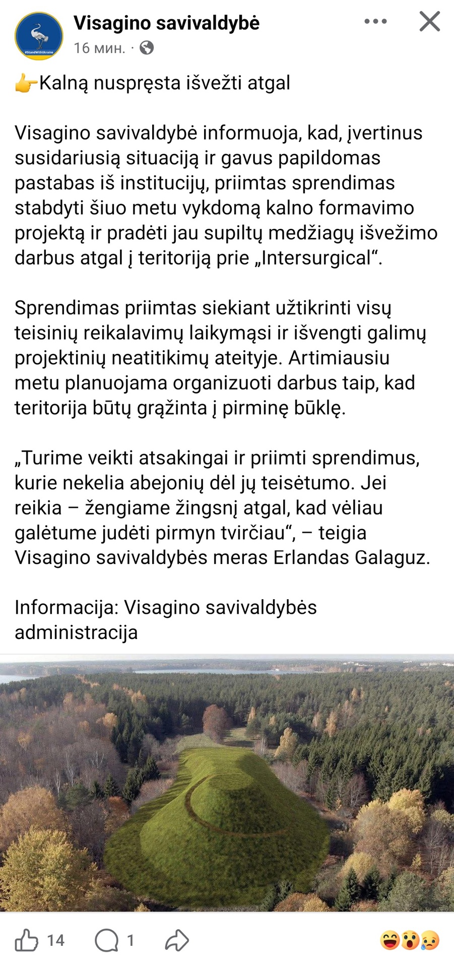 «Мы должны действовать ответственно и принимать решения, не вызывающие сомнений в их законности. Если нужно — делаем шаг назад, чтобы затем двигаться вперёд более уверенно», — заявил мэр Висагинского самоуправления Эрландас Галагуз.