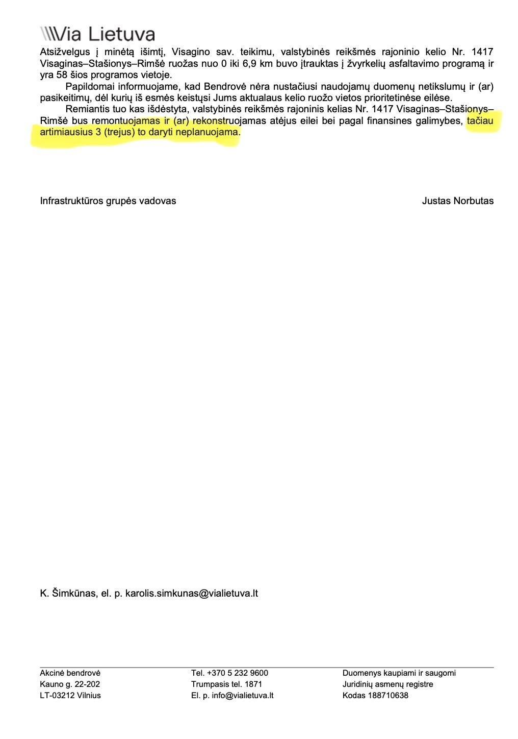 «Valstybinės reikšmės rajoninis kelias Nr. 1417 Visaginas–Stasions–Rimšė bus remontuojamas ir (ar) rekonstruojamas atėjus eilei bei pagal finansines galimybes, tačiau artimiausius 3 (trejus) to daryti neplanuojama» – то есть дорога будет ремонтироваться или реконструироваться по очереди и при наличии финансирования, однако в ближайшие три года этого делать не планируется.