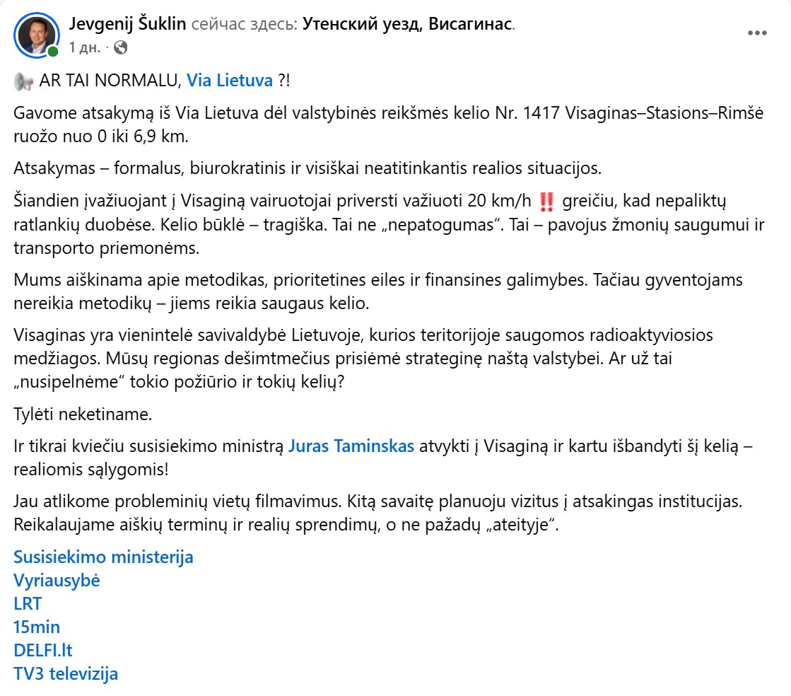 Член Сейма Евгений Шуклин опубликовал в социальной сети Facebook ответ компании Via Lietuva о состоянии дороги государственного значения № 1417 Римше–Висагинас. Документ, по словам политика, носит формальный характер и не отражает реального положения дел.