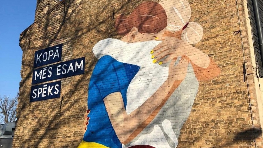 Стрит-арт на одном из домов в Риге в поддержку Украины. Фото: Baiba Braže. Источник: twitter/NATOBrazeB