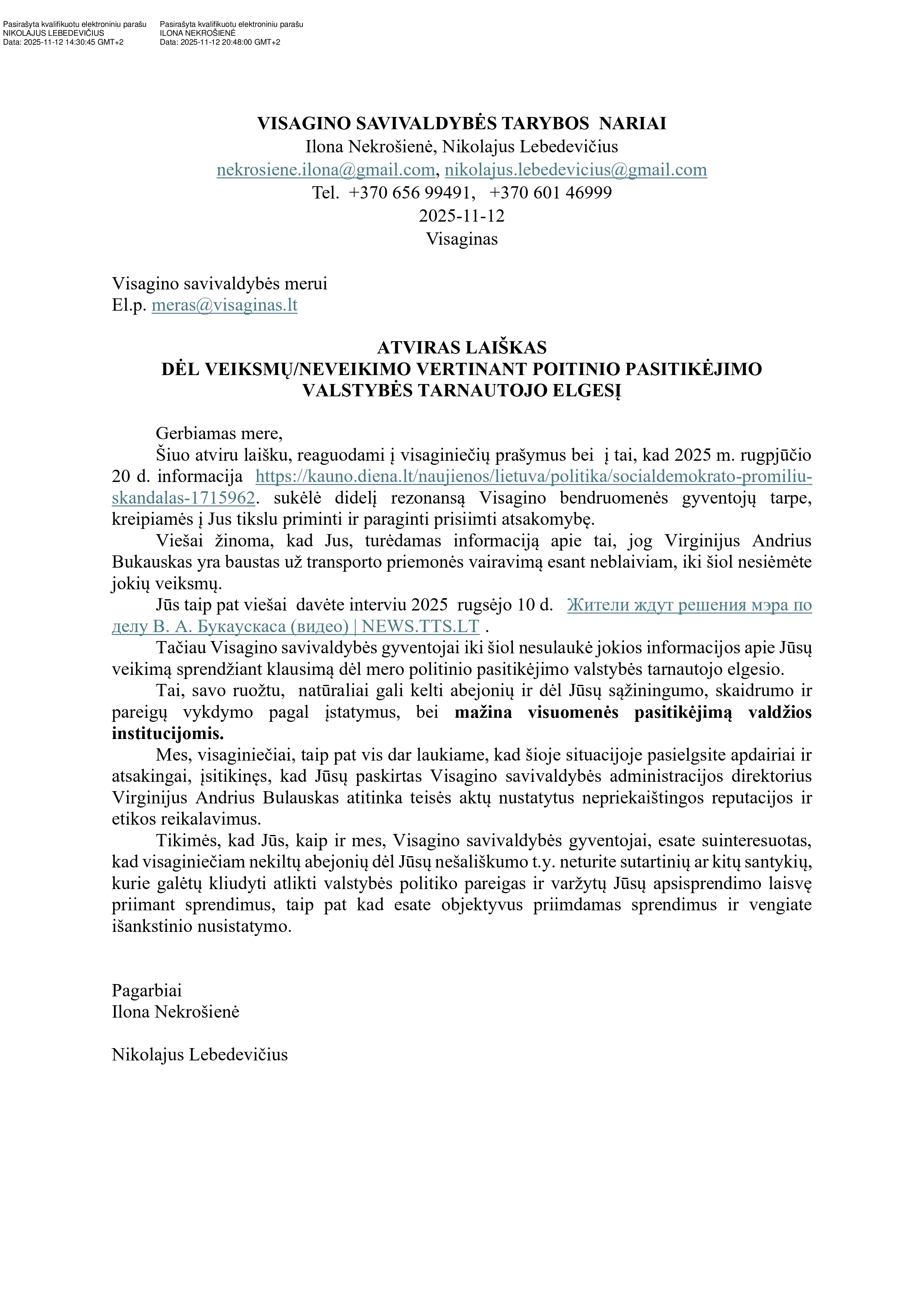 Этим открытым письмом, реагируя на просьбы жителей Висагинаса, а также на тот факт, что 20 августа 2025 года информация...https://kauno.diena.lt/naujienos/lietuva/politika/socialdemokrato-promiliu-skandalas-1715962. вызвала большой резонанс среди жителей Висагинаса, мы обращаемся к Вам с целью напомнить и призвать взять на себя ответственность.