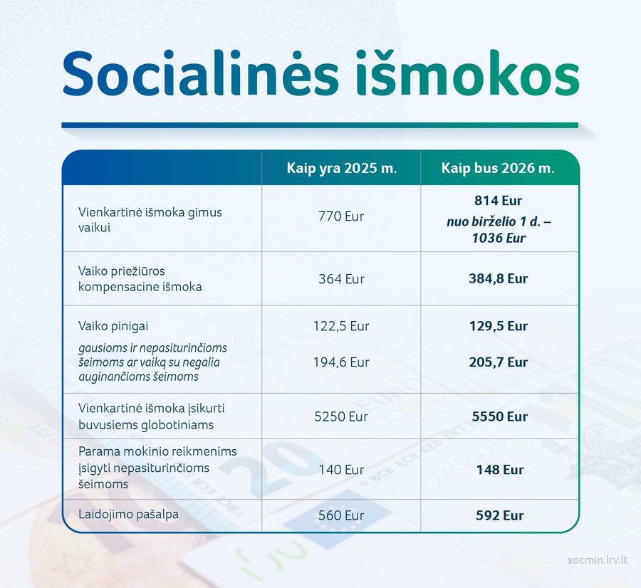 2025-12-29 Vyriausybė patvirtino Socialinės apsaugos ir darbo ministerijos siūlomus 2026 m. bazinių socialinės apsaugos išmokų dydžius, nuo kurių priklauso įvairių išmokų dydžiai 2026 metais. Baziniai dydžiai, palyginus su 2025 m., padidės 5,2-5,7 proc.